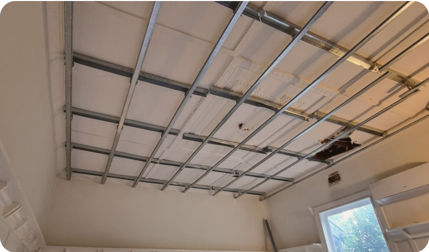 Horizontal strips of wood or metal attached to the ceiling joists, providing a surface to attach ceiling boards.